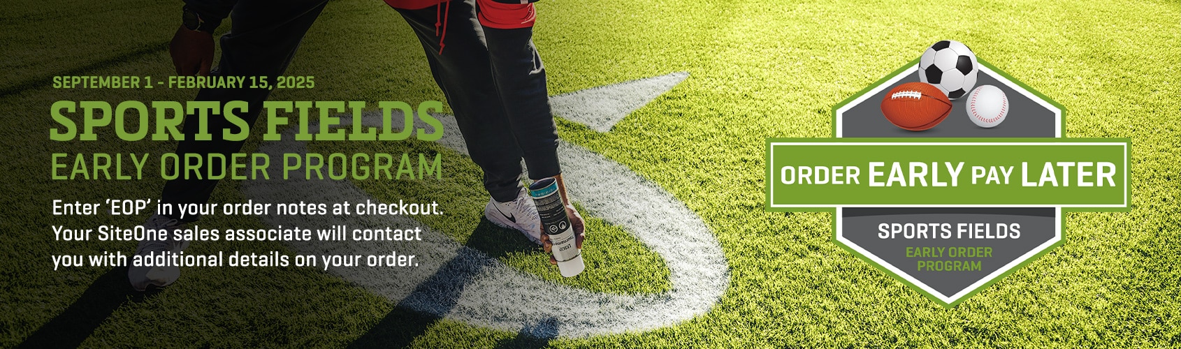 TERMS: Offers valid September 1–February 15, 2025 for sports turf management customers in the U.S. only. All eligible orders must be on a single order to qualify for extended terms and pay discounts. Product purchases must be at standard customer list price. Cannot be combined with any other SiteOne, National Account or LESCO incentives, special nets, government bids and/or contract pricing. Products shipped after EOP will be priced at time of shipment and additional exclusions, terms and conditions apply. SiteOne reserves the right to amend this program. Additional 5% OFF Sports Turf products available only for a select Turface, DuraEdge, Underhill, Line to Line and Seymour Midwest products. See Associate for more Details.