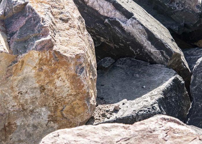 Rough-hewn dark and light gray quarried boulders with hints of tan. Perfect as garden accents or a landscape focal point.