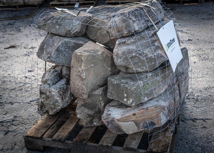 Smaller irregular shaped fieldstone boulders that come in caged pallets. Range from basketball to beachball sizes.